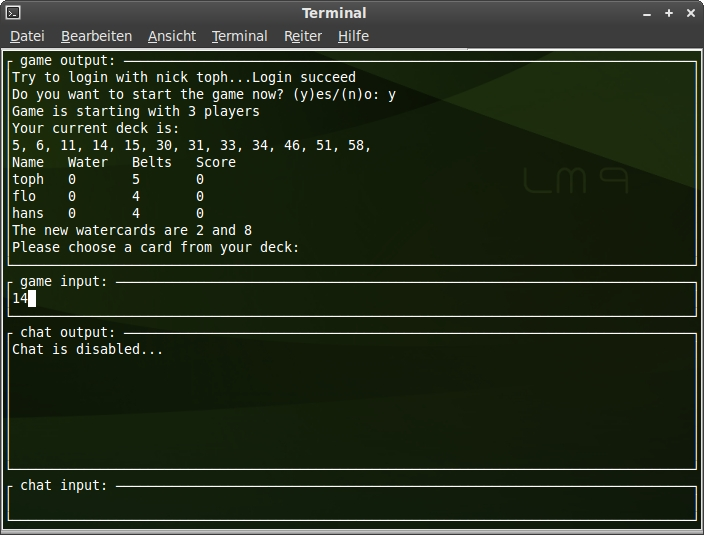 The curses client supports the complete fkmlandunter protocol, although the implementation of the chat has not been thoroughly debugged as of now.